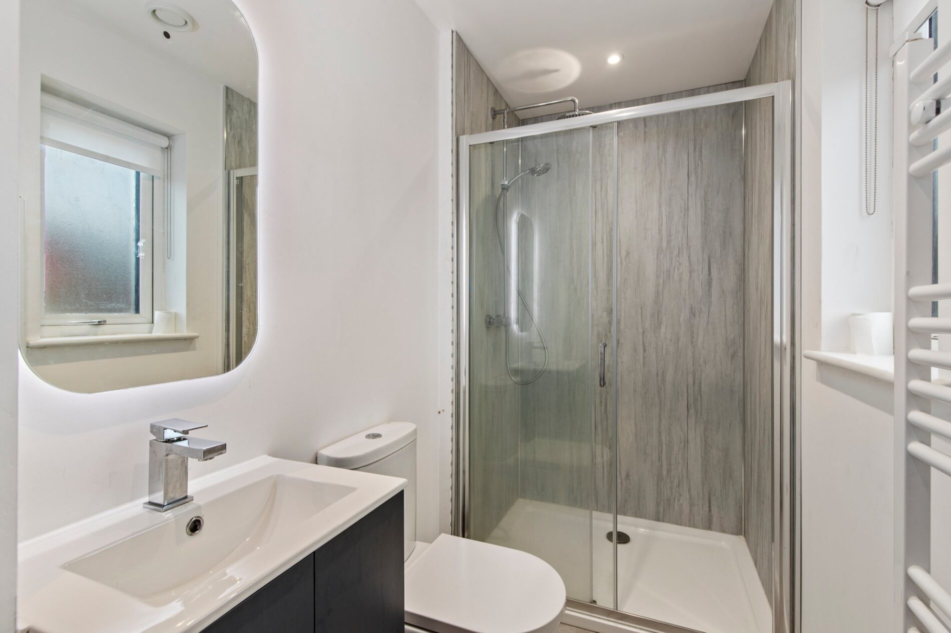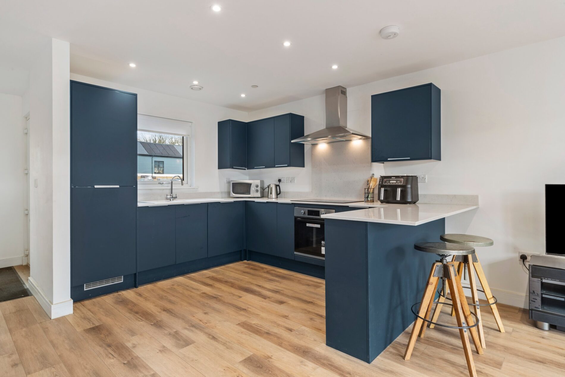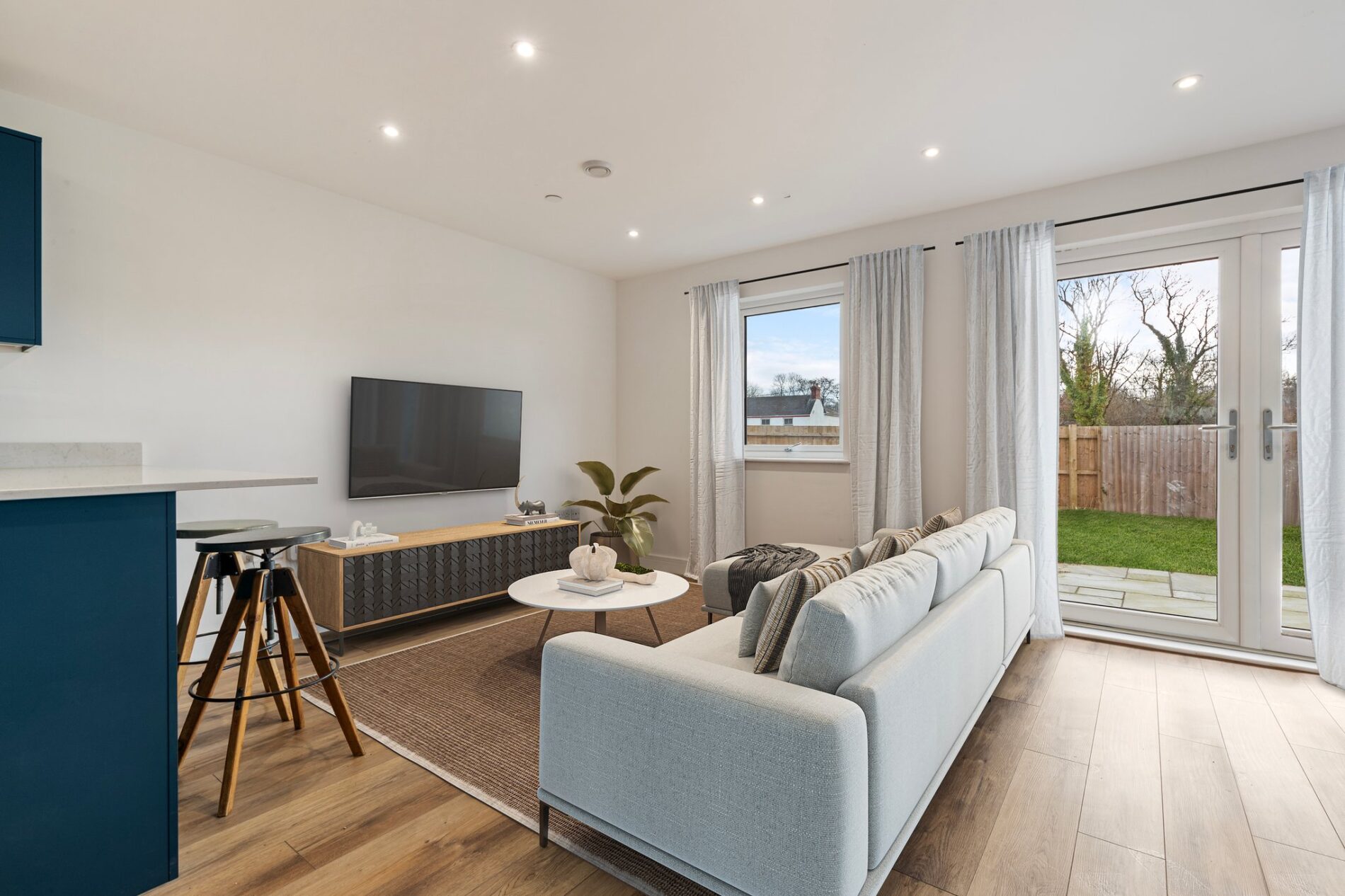 - Modern, practical layout offering an open-plan kitchen/living space with glazed doors to the garden, plus two double bedrooms, each with its own en-suite.